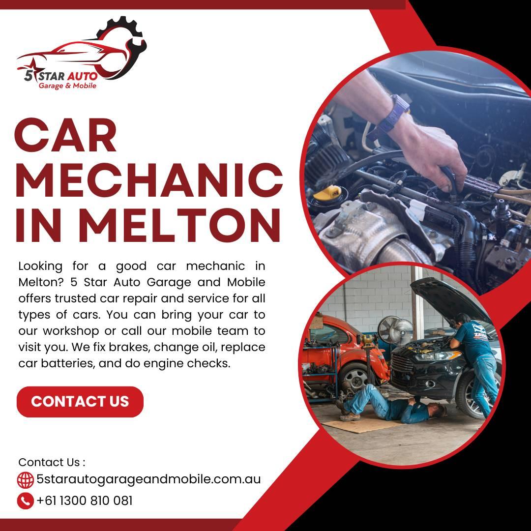 - 5 Star Auto Garage and Mobile is your trusted local mechanic offering both in-garage and mobile automotive services across Melton and surrounding areas. We believe in honest work, quality repairs, and getting you back on the road with confidence. Whether your car needs regular servicing, brake repairs, or full diagnostics, our experienced team is here to help. Our mobile service brings convenience straight to your doorstep without compromising on quality. At 5 Star, we make car care easy, reliable, and always customer-first.