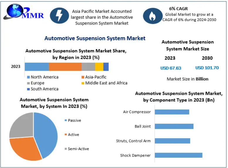 Automotive Suspension System Market was valued at USD 67.63 Bn. in 2023. Automotive Suspension System Market size is expected to grow at a CAGR of 6% through the forecast period.