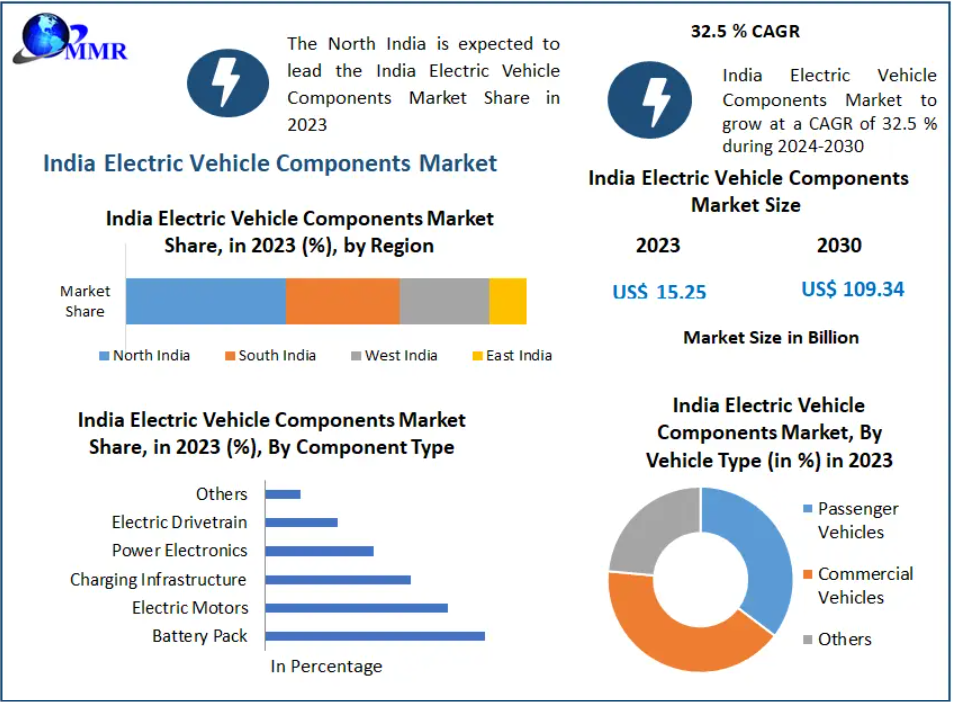 The India Electric Vehicle Components Market, valued at USD 15.25 billion in 2023, is on an exceptional growth trajectory, projected to reach USD 109.34 billion by 2030, expanding at a CAGR of 32.5%. Fueled by technological innovation, rising environmental consciousness, and strong governmental support, the market is transforming India's automotive landscape and catalyzing the shift toward clean mobility.