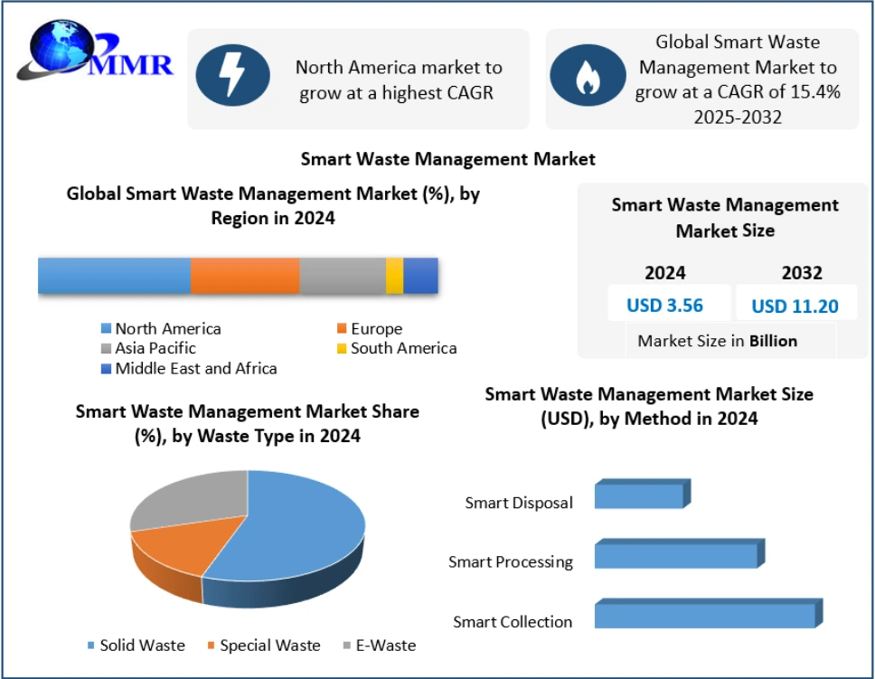 The Global Smart Waste Management Market, valued at USD 3.56 billion in 2024, is poised for rapid expansion as it is expected to grow at a CAGR of 15.4%, reaching USD 11.20 billion by 2032. With urban populations expanding, cities are under pressure to modernize their waste handling approaches. Smart waste systems—powered by IoT, artificial intelligence, advanced sensors, and cloud connectivity—are emerging as the backbone of next-generation sustainable waste ecosystems.