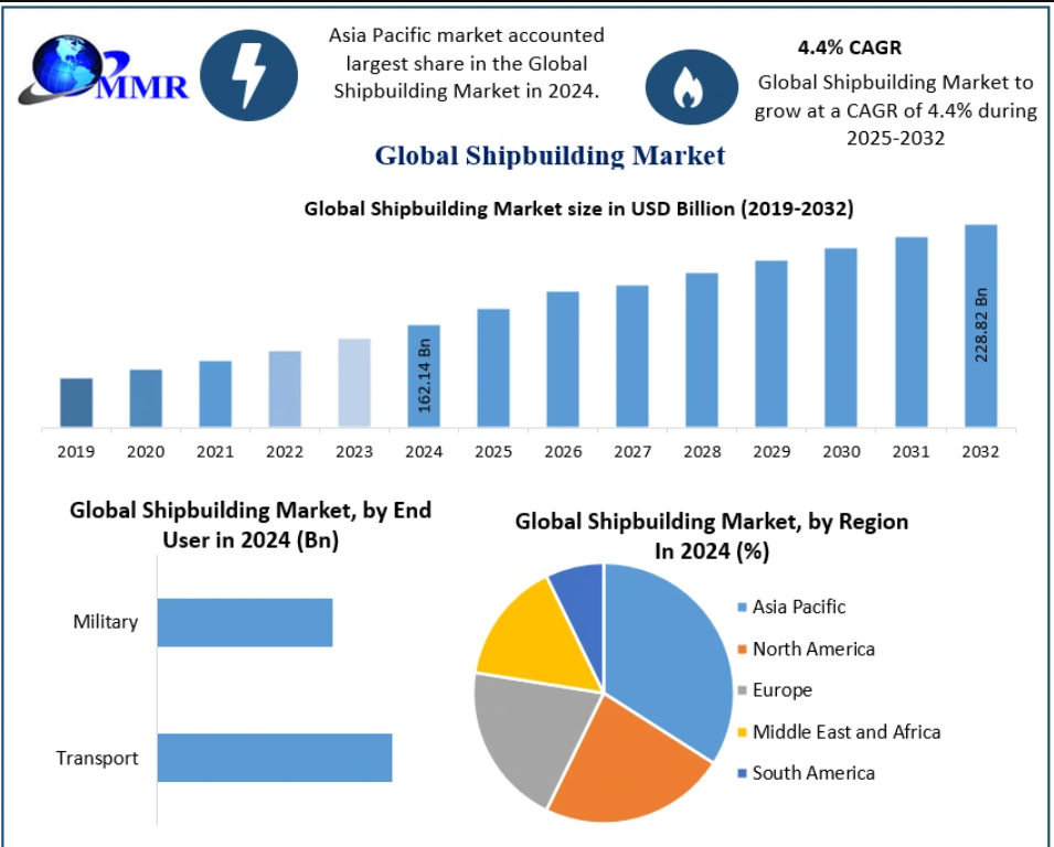 The Global Shipbuilding Market, valued at USD 162.14 billion in 2024, is projected to reach USD 228.82 billion by 2032, registering a CAGR of 4.4% during the forecast period. Shipbuilding—a discipline that blends engineering, innovation, and strategic manufacturing—remains a cornerstone of global trade, military strength, and offshore energy operations.