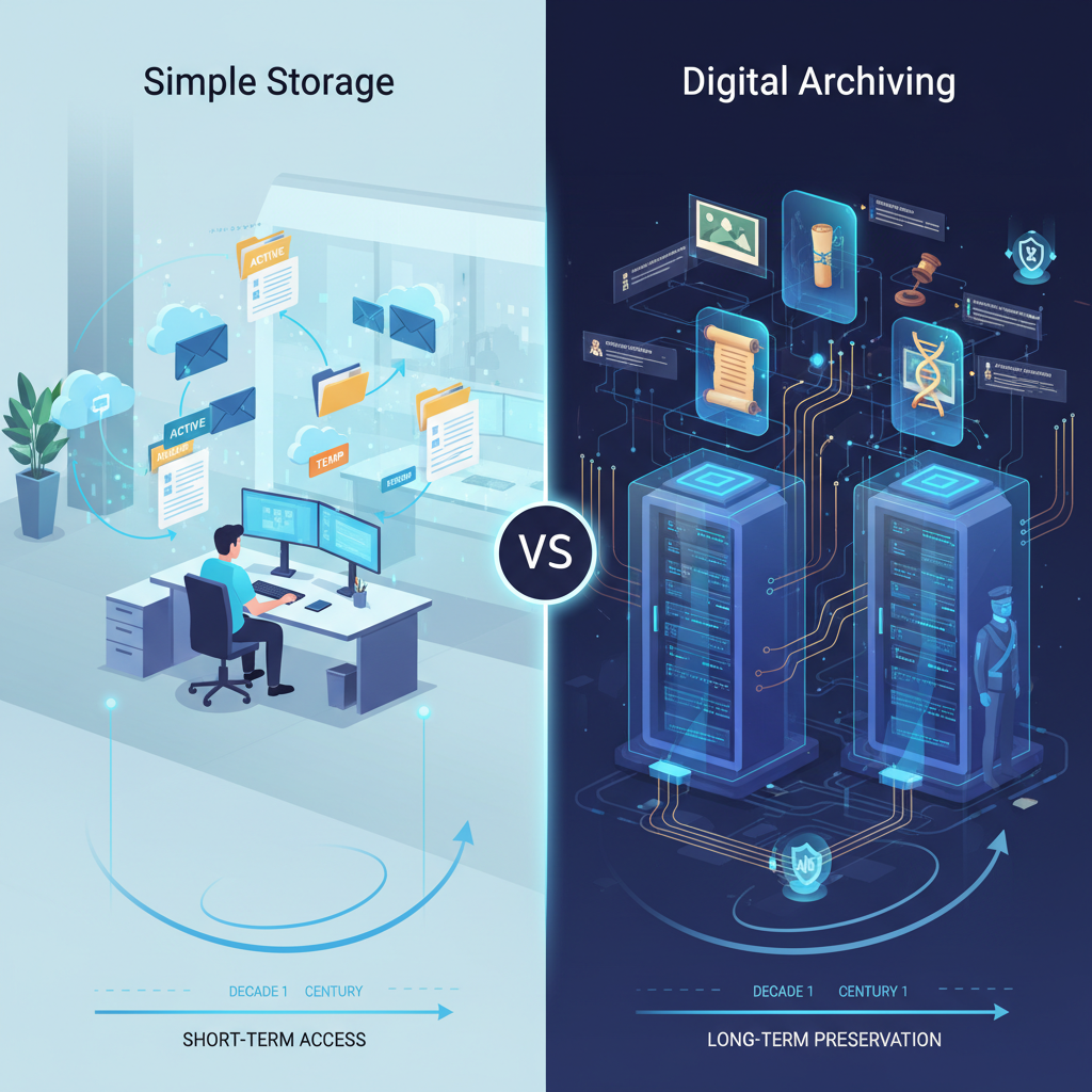 In the age of digital transformation, managing an organization's growing data effectively is more important than ever. Decision-makers are increasingly tasked with choosing between Digital Archiving and simple storage solutions. While both are crucial for data management, they serve different functions digital archiving offers long-term preservation and organization, while simple storage focuses on basic data storage without added complexities.