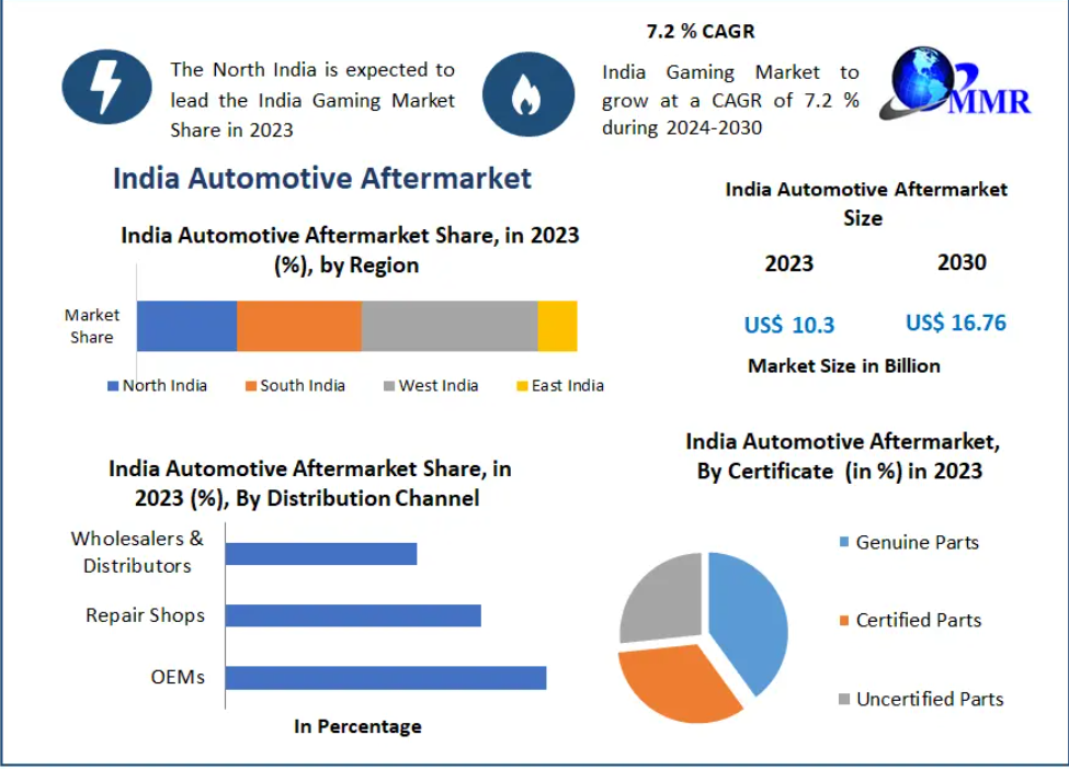 The India Automotive Aftermarket, valued at USD 10.3 billion in 2023, is set for steady and sustainable expansion. With a projected CAGR of 7.2% from 2024 to 2030, the market is expected to reach nearly USD 16.76 billion, driven by rapid vehicle parc expansion, the rise of organized pre-owned vehicle sales, and transformative shifts in business models and technology adoption.