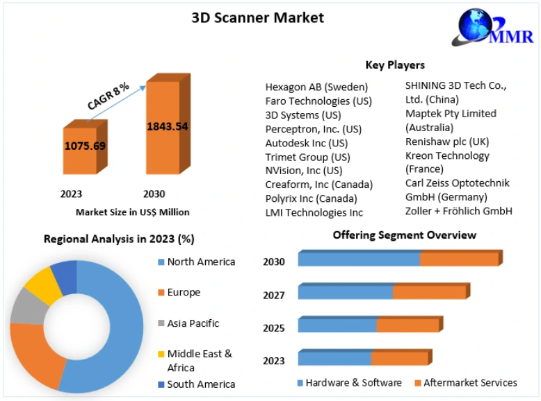 The 3D Scanner Market, valued at USD 1,075.69 million in 2023, is entering a new era of technological advancement. As industries shift toward digital workflows, automation, and immersive technologies, 3D scanning has become a mission-critical tool, driving the market toward an estimated USD 1,843.54 million by 2030, expanding at a CAGR of 8% during the forecast period.