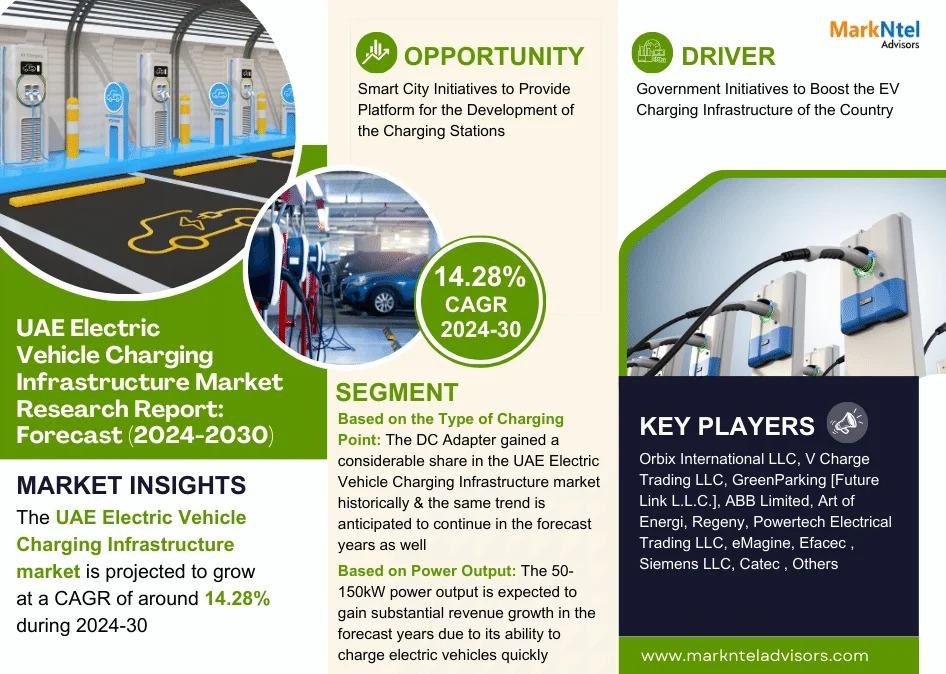 MarkNtel Advisors, a leading market research and consulting firm, has announced the release of its latest study titled UAE Electric Vehicle Charging Infrastructure Market Research Report: Forecast (2024–2030). This report provides a detailed assessment of the UAE Electric Vehicle Charging Infrastructure, covering its evolving dynamics, emerging trends, key growth drivers, major challenges, and competitive landscape.