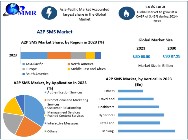 The A2P (Application-to-Person) SMS Market, valued at USD 68.90 billion in 2023, is steadily advancing toward USD 87.25 billion by 2030, growing at a CAGR of 3.43%. Despite the explosion of over-the-top (OTT) messaging apps, SMS continues to stand its ground as the most reliable, accessible, and universally supported digital communication channel for enterprises. Its unmatched reach—spanning smartphones, feature phones, and even low-connectivity regions—keeps A2P SMS at the center of customer engagement strategies globally.