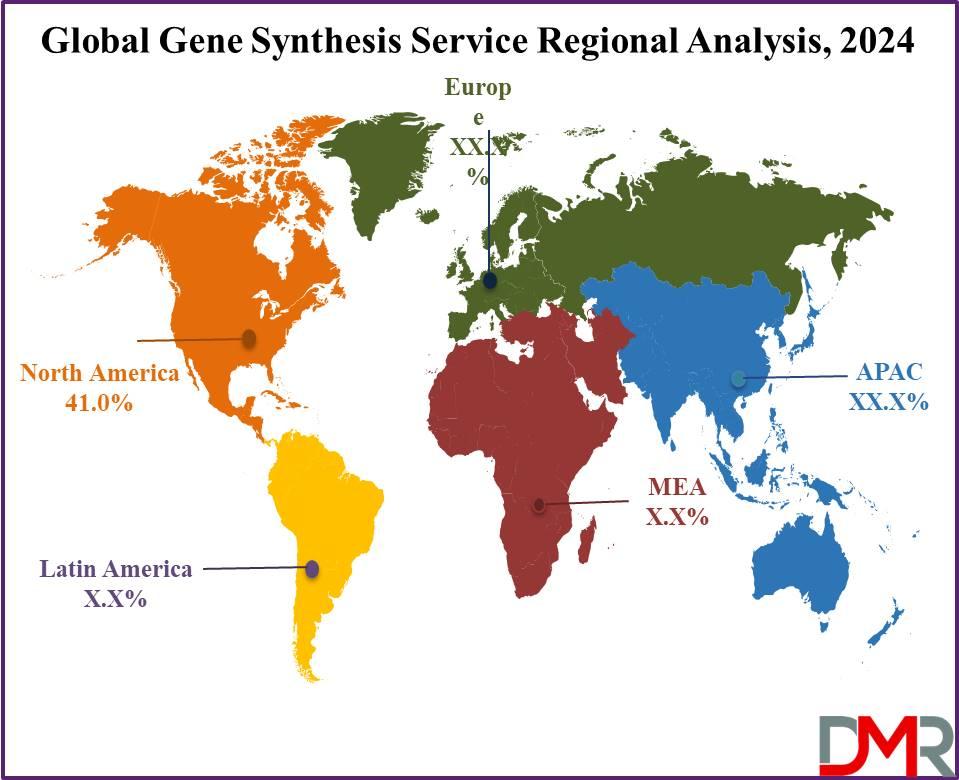 North America holds the largest share of approximately 41% of the global Gene Synthesis Service Market, supported by strong biotechnology and pharmaceutical industries, advanced research facilities, and significant investments in genomics. The region benefits from robust government funding, well-established academic institutions, and a high concentration of leading market players. Extensive R&D activities, rising acceptance of personalized medicine, and increasing adoption of gene editing technologies further bolster the market. The sophisticated regulatory environment and strong intellectual property protections foster innovation and create a favorable business landscape for gene synthesis providers.
