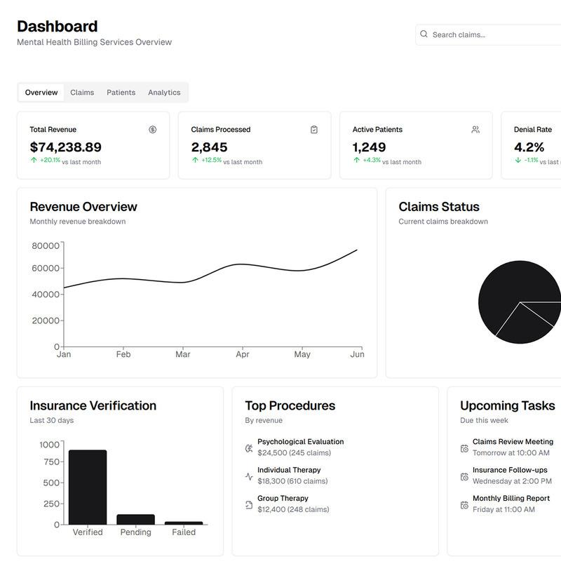Managing the financial side of a mental health practice can be challenging. From insurance claim denials to complex billing codes, administrative burdens can distract providers from focusing on patient care. Our Mental Health Billing Services are designed to simplify the revenue cycle, reduce errors, and ensure timely reimbursements, helping your practice run efficiently and profitably.