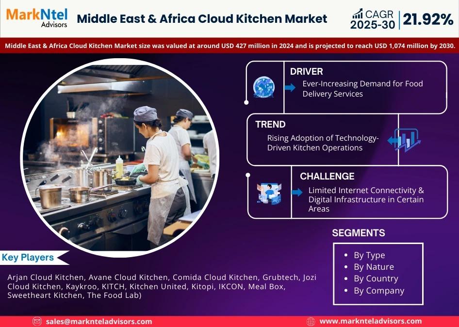 MarkNtel Advisors, a leading market research and consulting firm, has announced the release of its latest study titled Middle East & Africa Cloud Kitchen Market Research Report: Forecast (2025-2030). This report provides a detailed assessment of the Middle East & Africa Cloud Kitchen Market, covering its evolving dynamics, emerging trends, key growth drivers, major challenges, and competitive landscape.