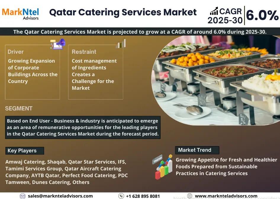 MarkNtel Advisors, a leading market research and consulting firm, has announced the release of its latest study titled Qatar Catering Services Market Research Report: Forecast (2025-2030). This report provides a detailed assessment of the Qatar Catering Services Market, covering its evolving dynamics, emerging trends, key growth drivers, major challenges, and competitive landscape.