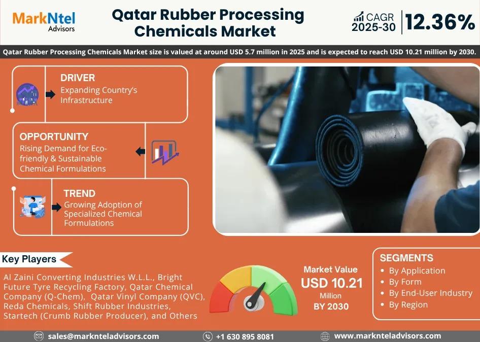 MarkNtel Advisors, a leading market research and consulting firm, has announced the release of its latest study titled Qatar Rubber Processing Chemicals Market Research Report: Forecast (2025-2030). This report provides a detailed assessment of the Qatar Rubber Processing Chemicals Market, covering its evolving dynamics, emerging trends, key growth drivers, major challenges, and competitive landscape.