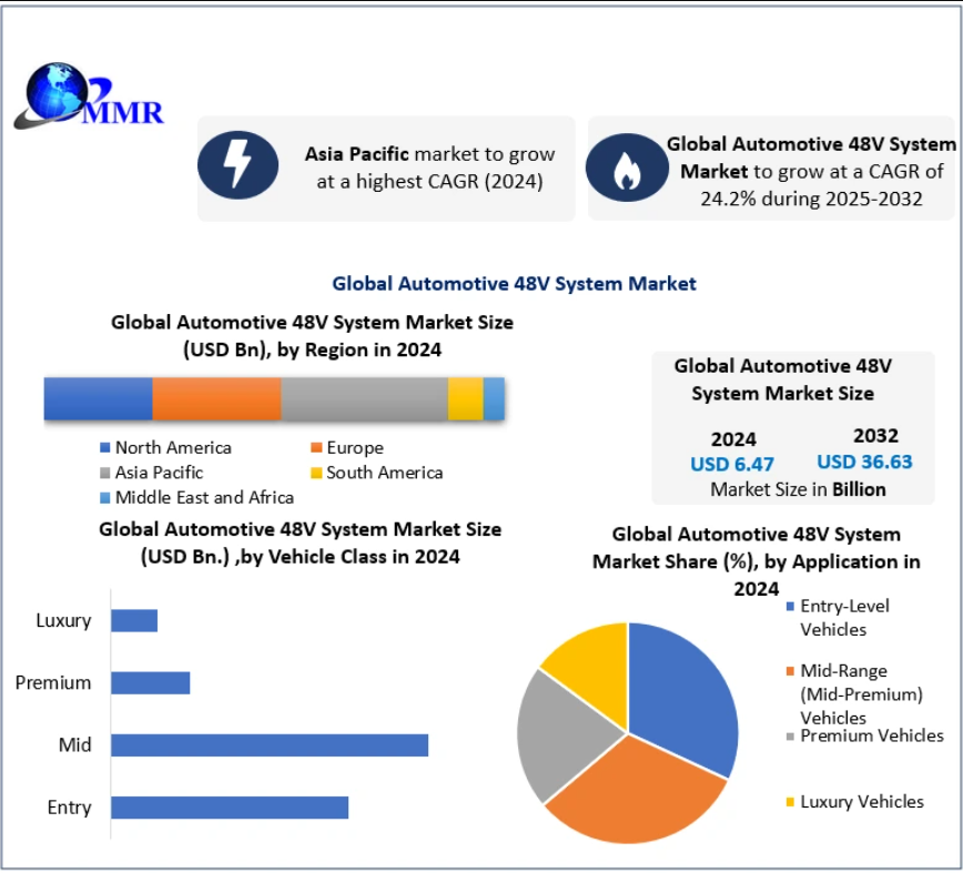 The global Automotive 48V System Market was valued at USD 6.47 billion in 2024 and is undergoing rapid transformation as automakers accelerate electrification strategies. With growing pressure to reduce emissions while maintaining vehicle performance, the market is projected to expand at a robust CAGR of 24.2% from 2025 to 2032, reaching approximately USD 36.63 billion by 2032.