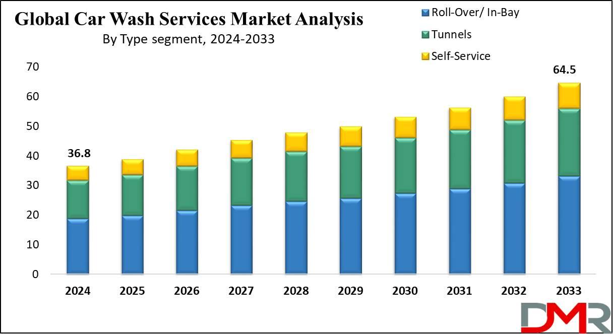Car wash services include a wide range of offerings such as self-service washes, automatic tunnel washes, in-bay automatics, full-service washes, and premium detailing services. The market has evolved significantly with the adoption of water-efficient systems, biodegradable cleaning agents, and automated equipment designed to improve service speed and consistency. Additionally, rising disposable income levels and heightened consumer focus on vehicle appearance and resale value have contributed to the steady uptake of premium car wash packages.