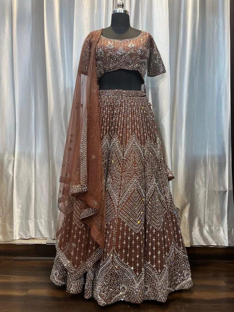 We offer a balanced mix of bridal lehengas, party gowns, shararas, anarkalis, and contemporary Indo-western designs—combining trend-driven styles with timeless elegance.