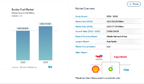 As per Mordor Intelligence, the global bunker fuel market is valued at USD 153.65 billion in 2025 and is expected to expand to USD 177.26 billion by 2030, registering a CAGR of 2.9% over the forecast period from 2025 to 2030. This growth is underpinned by steady global seaborne trade activity, increasing bunker fuel consumption from bulk carriers and tanker fleets, and sustained investments in low-sulfur and compliant marine fuels aligned with IMO 2020 sulfur emission regulations.