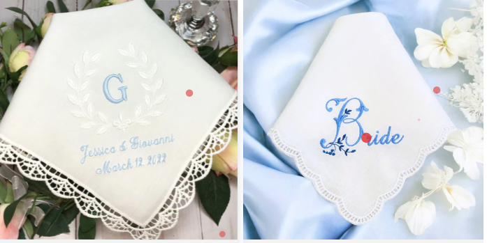 [Image suggestion: A crisp white wedding hanky with blue embroidery resting on a bridal bouquet]