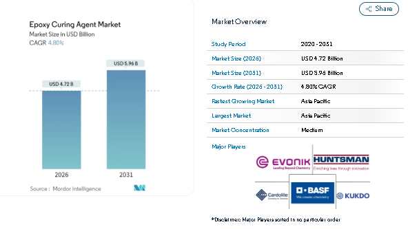 According to Mordor Intelligence, the Epoxy Curing Agents Market Size is estimated at USD 4.72 billion in 2026, rising from USD 4.5 billion in the previous year, and is projected to reach USD 5.96 billion by 2031. The market is expected to grow at a CAGR of 4.8 percent during the forecast period.