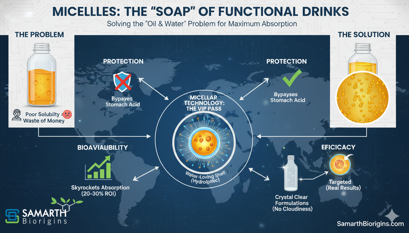 This is where poor solubility kills efficacy. But there’s a fix, and it’s changing the game for functional foods and beverages: Micellar Technology.