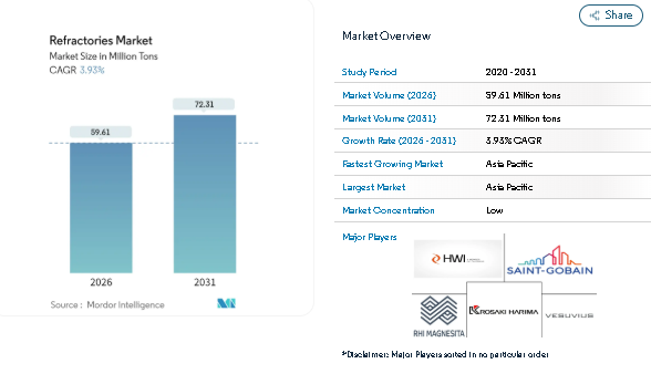 The Refractories Market plays a vital role in supporting industries that operate under extreme heat and chemical stress. According to the Mordor Intelligence assessment, the Refractories Market Size stood at 57.36 million tons in 2025, increased to 59.61 million tons in 2026, and is projected to reach 72.31 million tons by 2031, reflecting steady Refractories Market Growth over the forecast period.