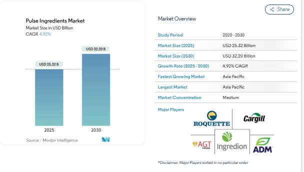 The Pulse Ingredients Market Size was valued at USD 25.32 billion in 2025 and is projected to reach USD 32.2 billion by 2030, according to Mordor Intelligence. The Pulse Ingredients Market Forecast indicates steady expansion as food manufacturers increasingly incorporate pulse-derived materials into everyday food products.
