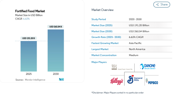 The Fortified Food Market continues to gain attention as consumers increasingly connect everyday eating habits with long-term health. According to industry analysis, the market was valued at USD 191.20 billion in 2025 and is projected to reach USD 263.54 billion by 2030, supported by growing interest in preventive nutrition and improved food labeling standards. The Fortified Food Market Forecast reflects steady expansion as more households adopt products enriched with vitamins, minerals, and functional nutrients.