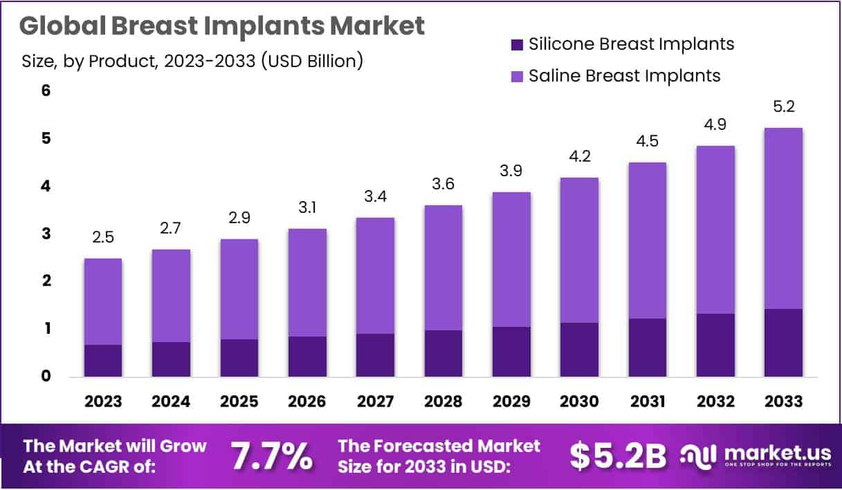 The breast implants market is projected to reach around USD 5.2 billion by 2033, growing from USD 2.5 billion in 2023. This reflects a strong compound annual growth rate (CAGR) of 7.7% between 2024 and 2033. This steady growth is linked to several health and lifestyle-related factors, including rising breast cancer cases, increased access to surgery, and growing acceptance of cosmetic enhancements.