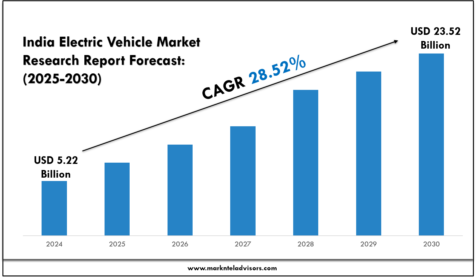 As India stubbornly battles pollution levels and embraces sustainable development, the electric vehicle Industry in India is anticipated to reflect this transformation dramatically. Projected to grow from approximately USD 5.22 billion in 2024 to around USD 23.52 billion by 2030, the India Electric Vehicle Market is poised to experience a remarkable compound annual growth rate (CAGR) of about 28.52% from 2025 to 2030. This impressive growth trajectory is propelled by a combination of innovative technological advancements, favorable government policies, and the expanding charging infrastructure, leading to a more sustainable transportation landscape.