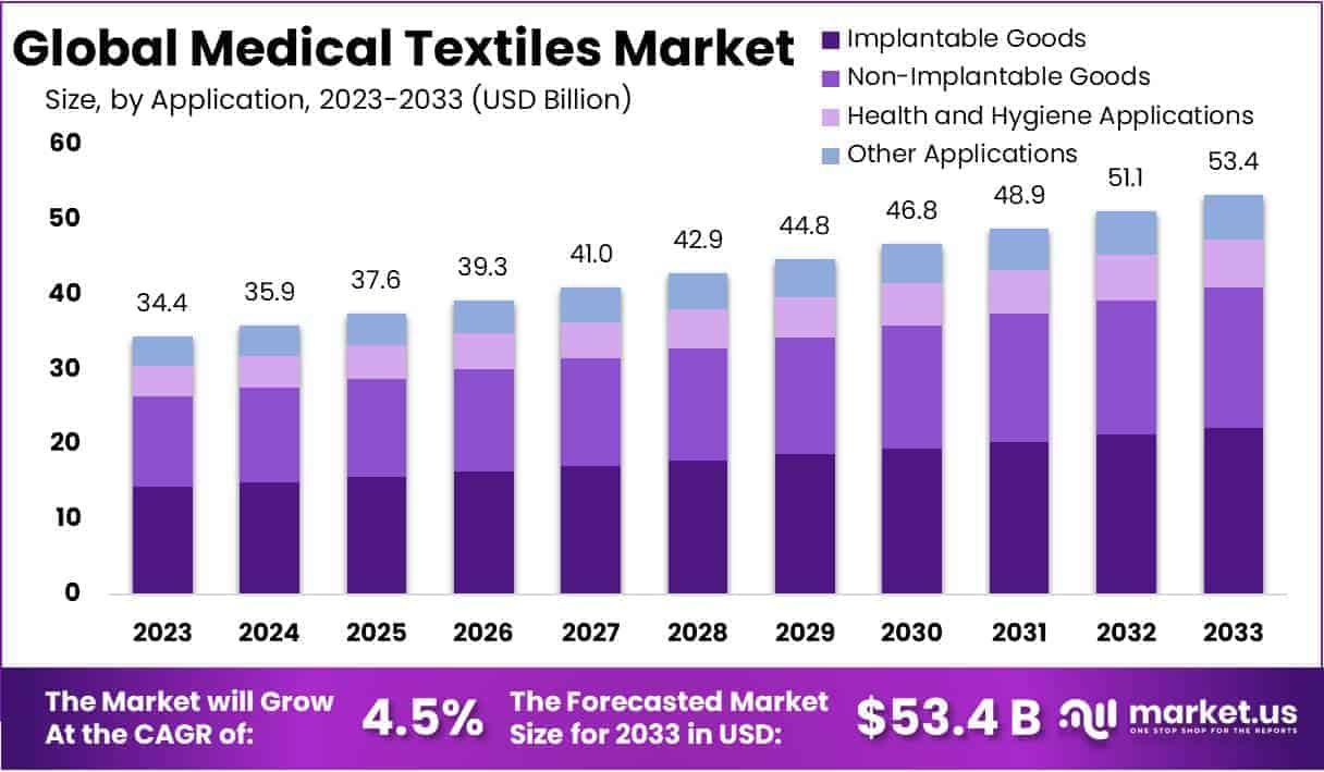 - The Medical Textiles Market is projected to grow from USD 34.4 billion in 2023 to USD 53.4 billion by 2033, at a 4.5% CAGR.