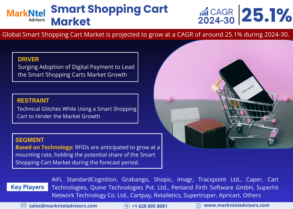 MarkNtel Advisors recently published a detailed Market analysis of the Global Smart Shopping Cart Market. The report covers growth trends, geographical marketing strategies, challenges, opportunities, and drivers influencing the market.
