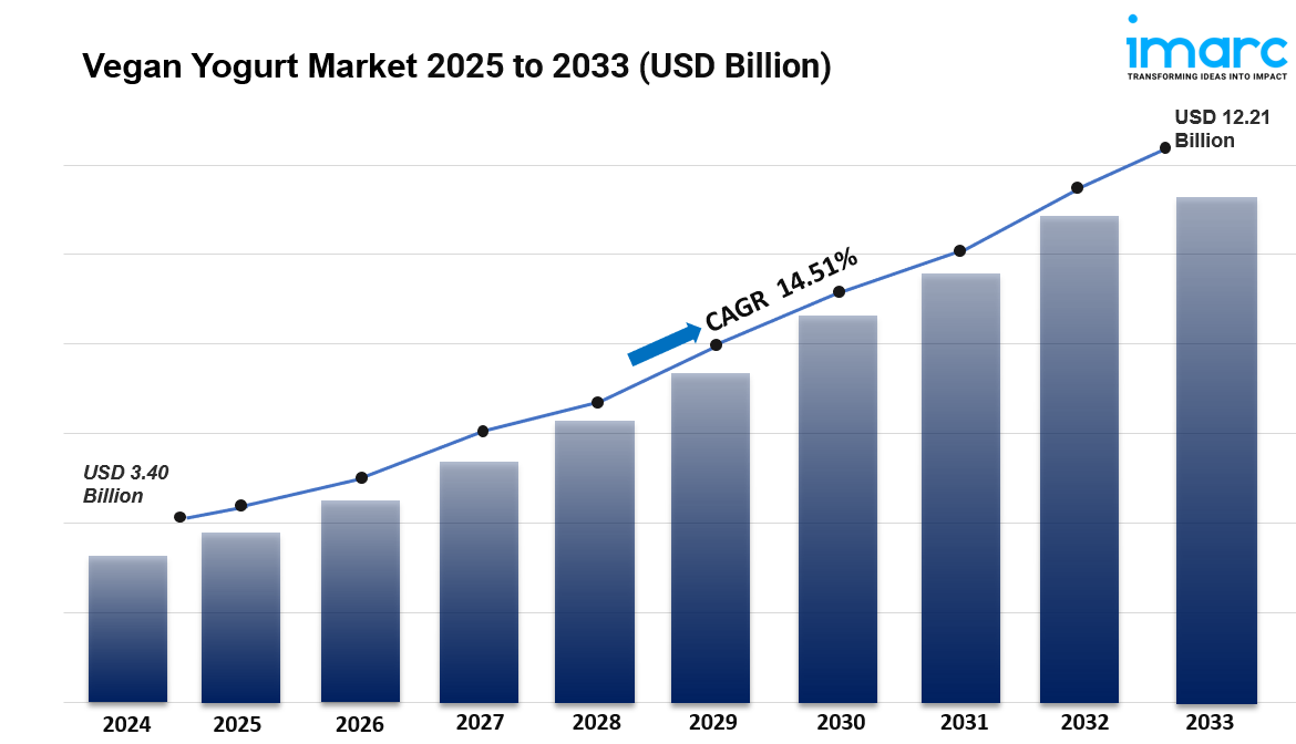 The global vegan yogurt market share was valued at USD 3.40 Billion in 2024. Looking forward, IMARC Group estimates the market to reach USD 12.21 Billion by 2033, exhibiting a CAGR of 14.51% from 2025-2033. North America currently dominates the market, holding a market share of over 35.4% in 2024. The growing health awareness among the masses, increasing prevalence of dietary restrictions, escalating concerns about climate change and environmental degradation, lower production costs of plant-based ingredients, and recent technological advancements are some of the major factors propelling the market in this region.
