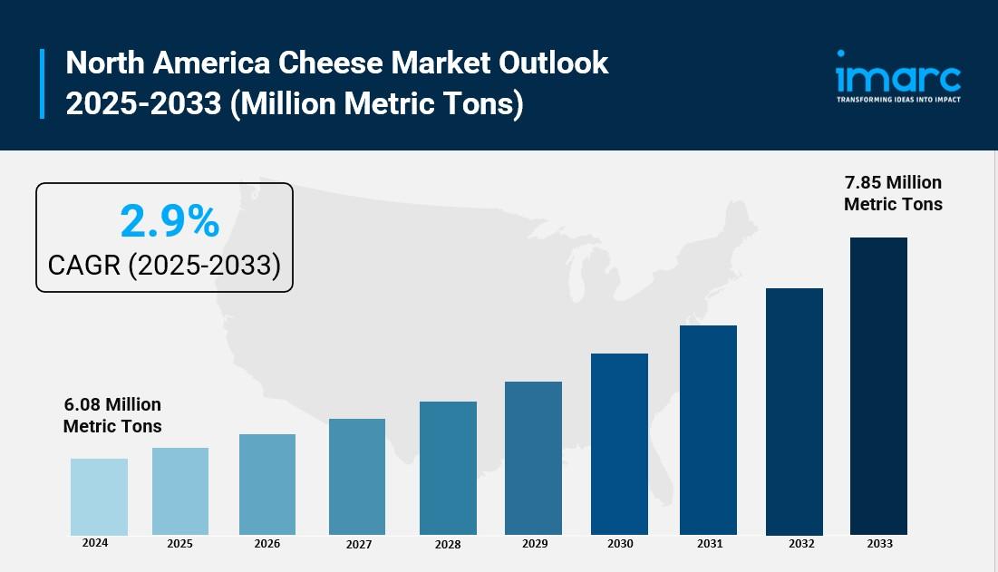 The North America cheese market size was valued at 6.08 Million Metric Tons in 2024. Looking forward, IMARC Group estimates the market to reach 7.85 Million Metric Tons by 2033, exhibiting a CAGR of 2.9% from 2025-2033.