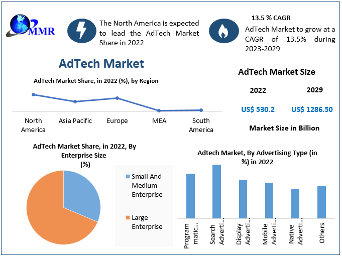 The market research report for AdTech provides comprehensive information on important factors, such as those that are expected to drive the industry's growth and future obstacles. This report provides stakeholders with a thorough understanding of the investment opportunities, product offerings, and competitive landscape of the AdTech industry. Furthermore, it is covered in the research are the sector quantitative and qualitative aspects. Within the framework of the MMR research, regional markets for the AdTech Market are evaluated in great detail.
