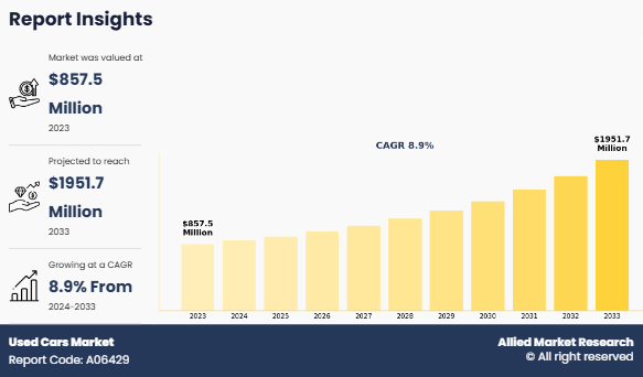According to a new report published by Allied Market Research, titled, “Used Cars ," The Used Cars Market Size was valued at $857.50 million in 2023, and is estimated to reach $2 billion by 2033, growing at a CAGR of 8.9% from 2024 to 2033.