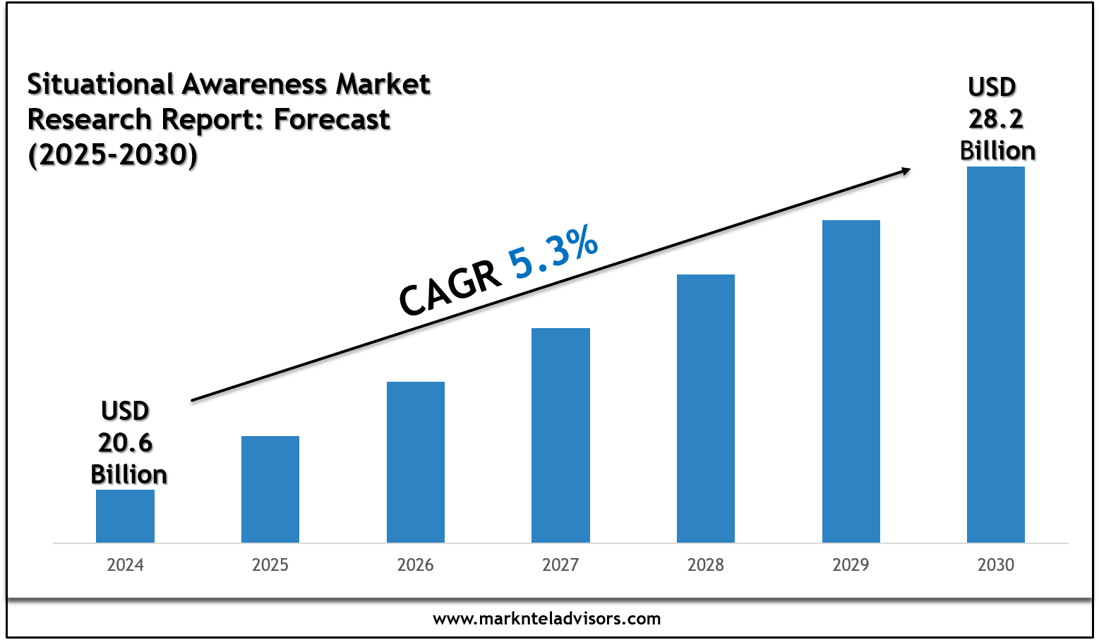 The Global Situational Awareness Market size was valued at around USD20.6 billion in 2024 and is projected to reach USD28.2 billion by 2030. Along with this, the market is estimated to grow at a CAGR of around 5.3% during the forecast period (2025-30). This expansion is attributed to multiple factors such as heightened worries about privacy and cyber security, government efforts, progress in AI and ML technologies, greater adoption of IoT and connected devices, the rise of smart cities globally, and the growing need for real-time insights to enhance operational efficiency.