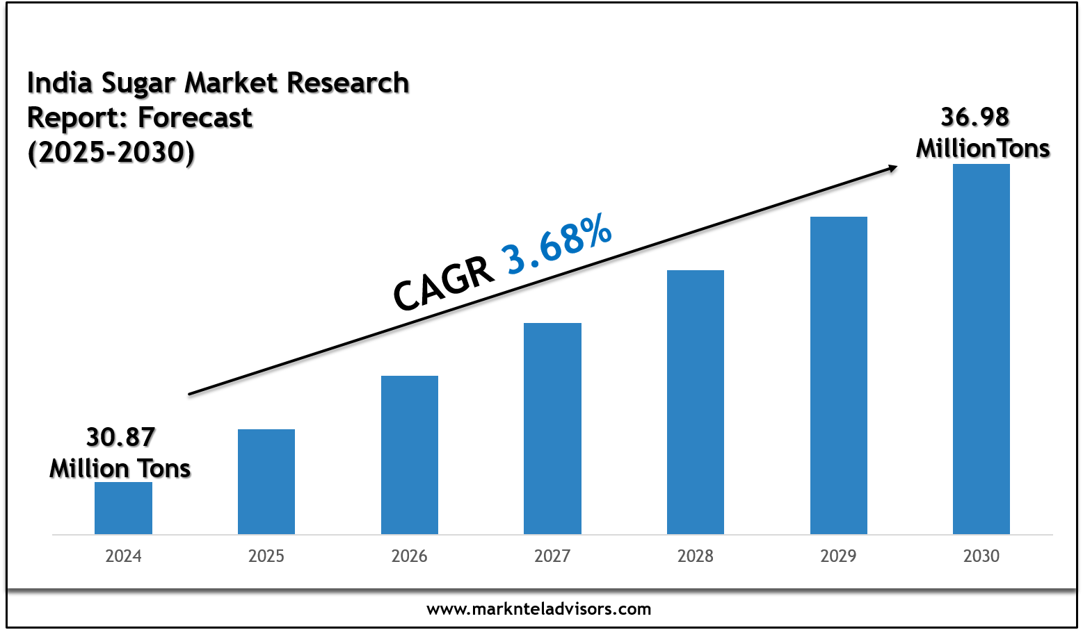 The India Sugar Market size was valued at around 30.87 million tons in 2024 and is projected to reach 36.98 million tons by 2030. Along with this, the market is estimated to grow at a CAGR of around 3.68% during the forecast period, i.e., 2025-30. The India Sugar Market is significantly growing due to several growth factors, including the large-scale production of sugarcane in the country, the rapidly growing consumer demand, the government's supportive initiatives, and the adoption of advanced farming practices etc. One of the most prominent growth factors is the rapid shift of production companies to manufacture branded and premium quality sugar instead of just plain sugar, which is sold in bulk. This rising inclination is due to the growing health concerns of the customers, who are preferring for organic sugar, with low values of glycemic index.