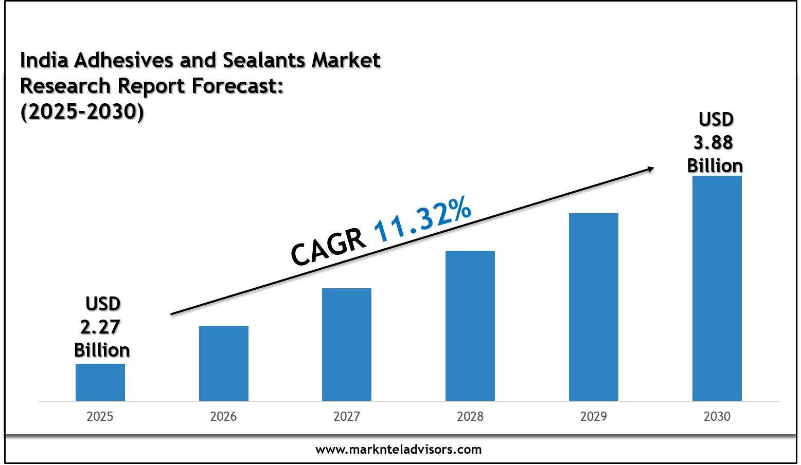 The India Adhesives and Sealants Market size is valued at around USD 2.27 billion in 2025 and is projected to reach USD 3.88 billion by 2030. Along with this, the market is estimated to grow at a CAGR of around 11.32% during the forecast period, i.e., 2025-30. The market has grown at a steady pace in the past few years, backed by the rising construction activities & infrastructure development, rapid growth in packaging & e-commerce in India, expanding automotive sector, technological advancements in adhesive and sealants formulation, and growing government stringent regulations on VOC emissions, etc.
