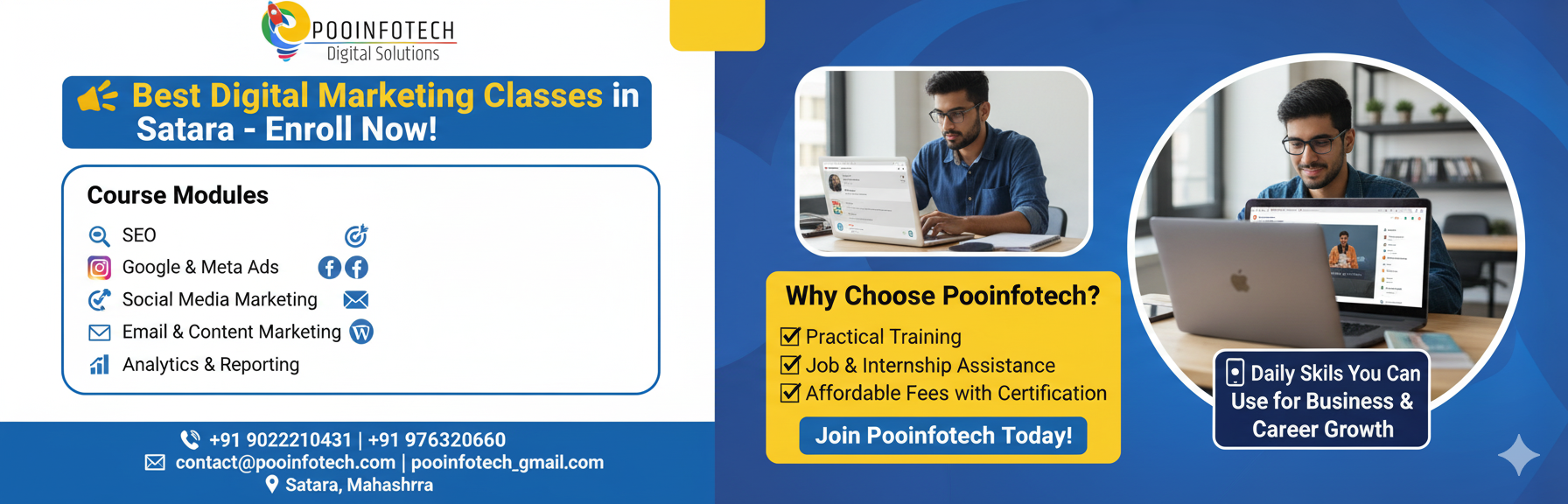 But digital marketing is a practical skill, and employers expect candidates who can run Google Ads, optimize websites for SEO, manage social media, and analyze results. That’s where institutes like PooInfotech – Best Digital Marketing Classes in Satara stand out.