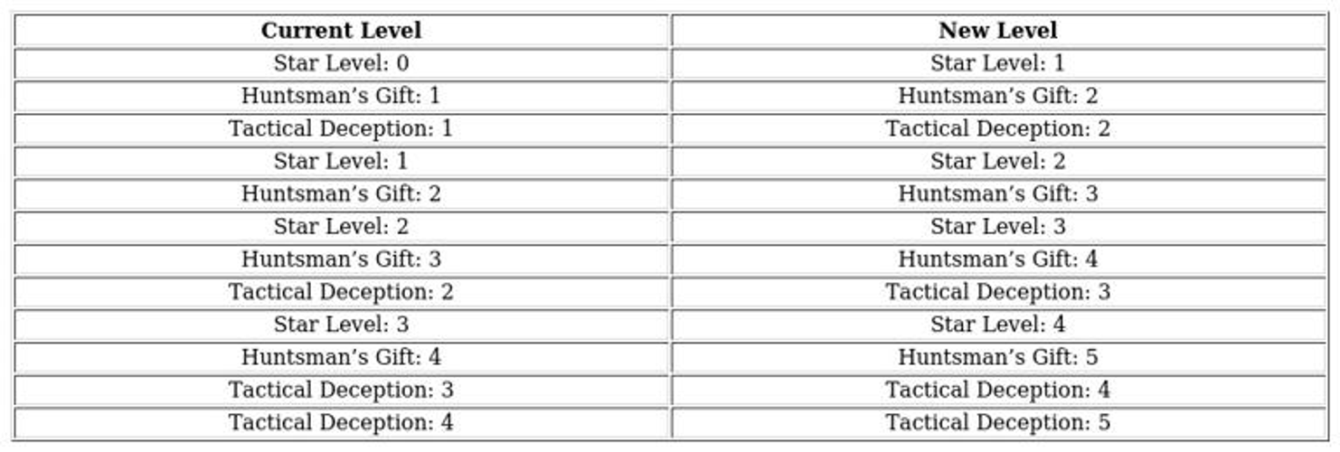 The initial column displays your hero’s existing skill level and star rating, while the adjacent column indicates the recommended upgrade targets.
