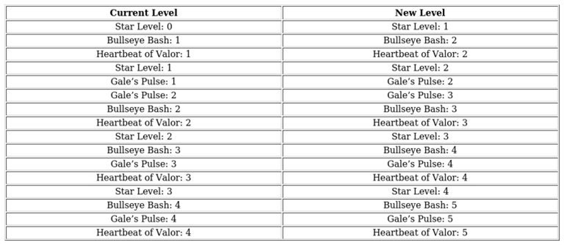 The initial column displays your hero's existing skill level and star rating.