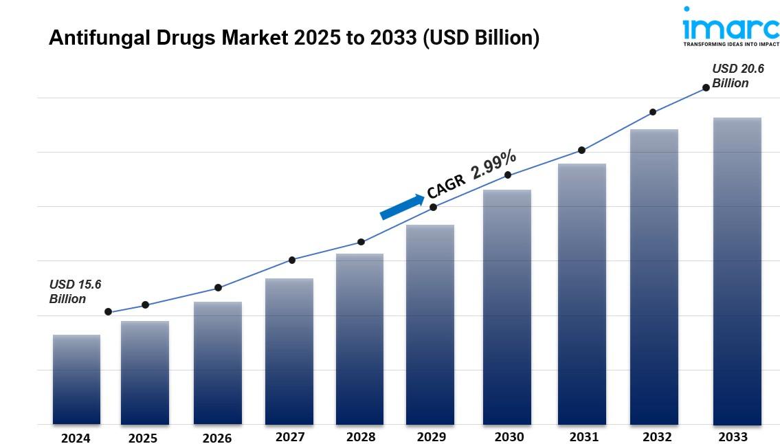 The global antifungal drugs market size reached USD 15.6 Billion in 2024. Looking forward, IMARC Group expects the market to reach USD 20.6 Billion by 2033, exhibiting a growth rate (CAGR) of 2.99% during 2025-2033. The rising prevalence of fungal infections, ongoing advancement in antifungal drug development, improved diagnostic technologies, and expanding geriatric population, are primarily driving the market's growth.