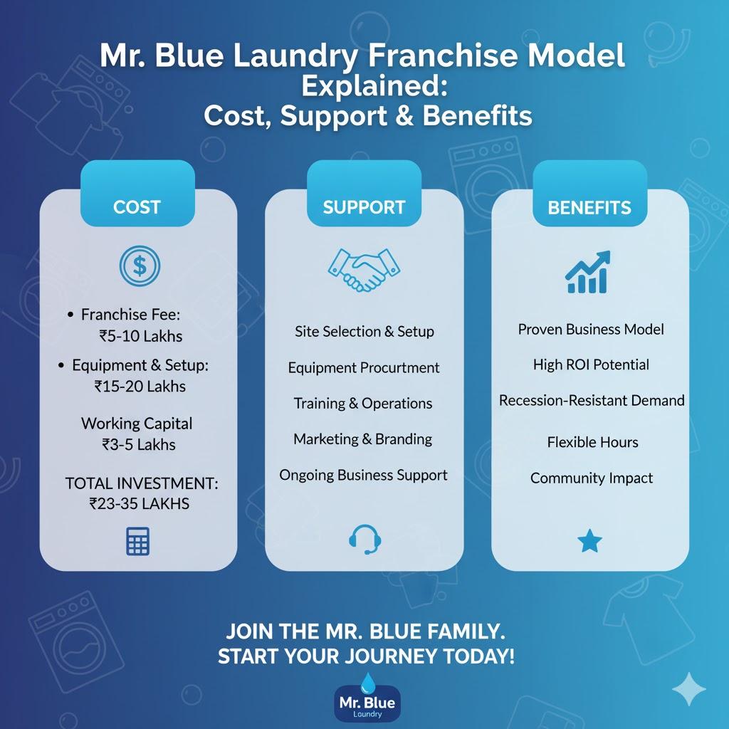 The laundry and dry-cleaning industry in India has been growing steadily as urban lifestyles become busier and consumers prioritize convenience and quality. One brand that has gained traction in this space is Mr. Blue — a chain of professional laundry outlets operating under a franchise model. If you’re considering a franchise opportunity in the service sector, this post breaks down the Mr. Blue franchise model, covering costs, operational support, and the benefits of investing in a laundry business franchise.