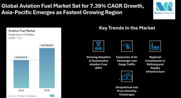 Discover the key trends and market forces pushing aviation fuel demand from USD 212.01 billion in 2025 to over USD 302.81 billion by 2030.