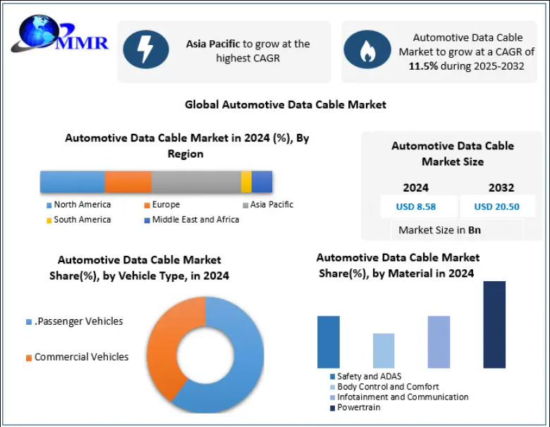 The Automotive Data Cable Market was valued at USD 8.58 billion in 2024 and is projected to reach USD 20.50 billion by 2032, growing at an impressive CAGR of 11.5% during the forecast period (2025–2032). The market’s growth is driven by the rapid electrification of vehicles, advancements in connectivity systems, and the increasing adoption of autonomous and intelligent vehicle technologies.