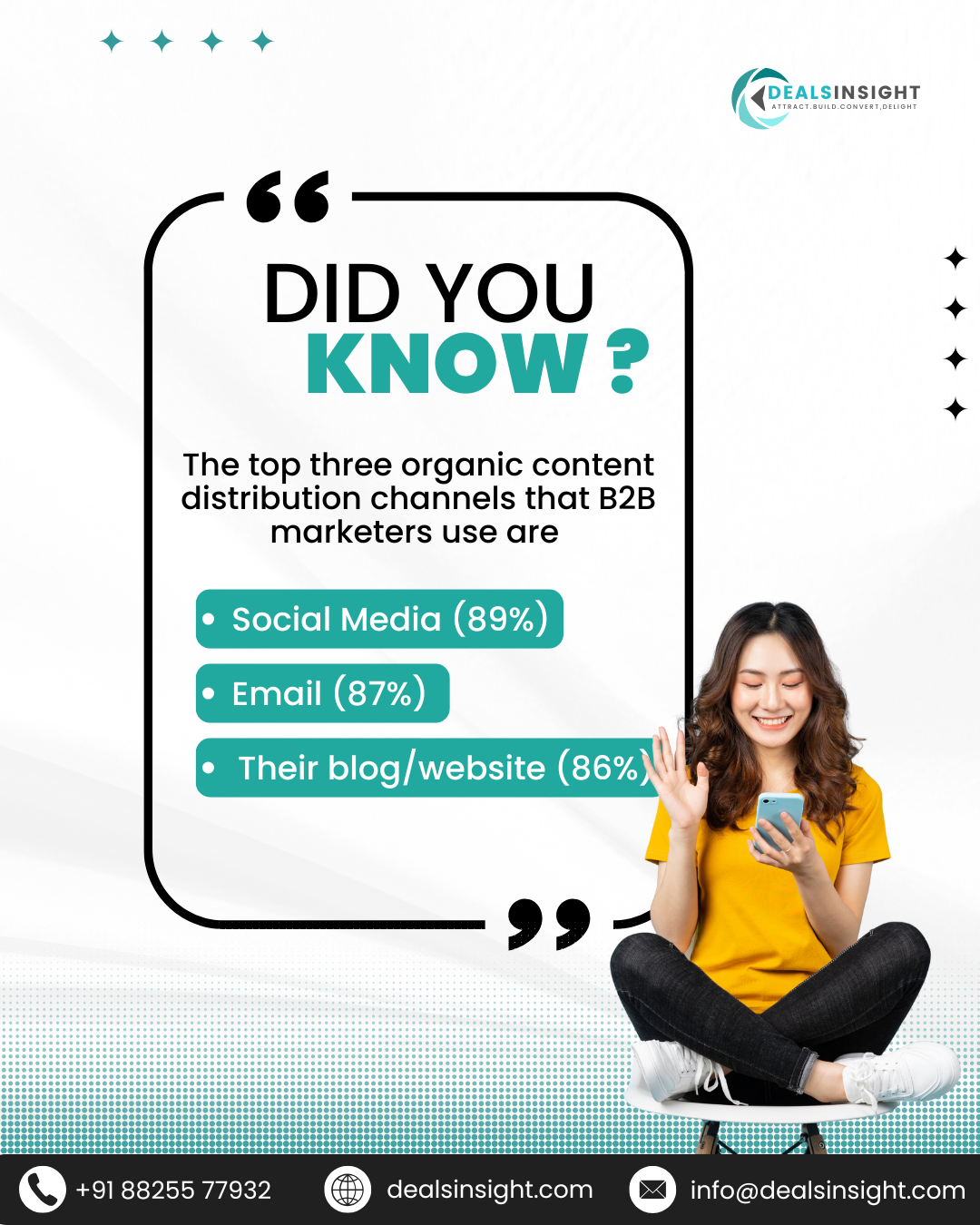 At DealsInsight, we specialize in B2B social media and organic content marketing that drives real engagement and long-term growth. Based in Chennai, we help B2B brands build authority through strategic use of LinkedIn, blogs, SEO-driven content, and thought leadership. Our tailored approach ensures your brand stays relevant, visible, and trusted in a competitive market—without relying on paid ads.