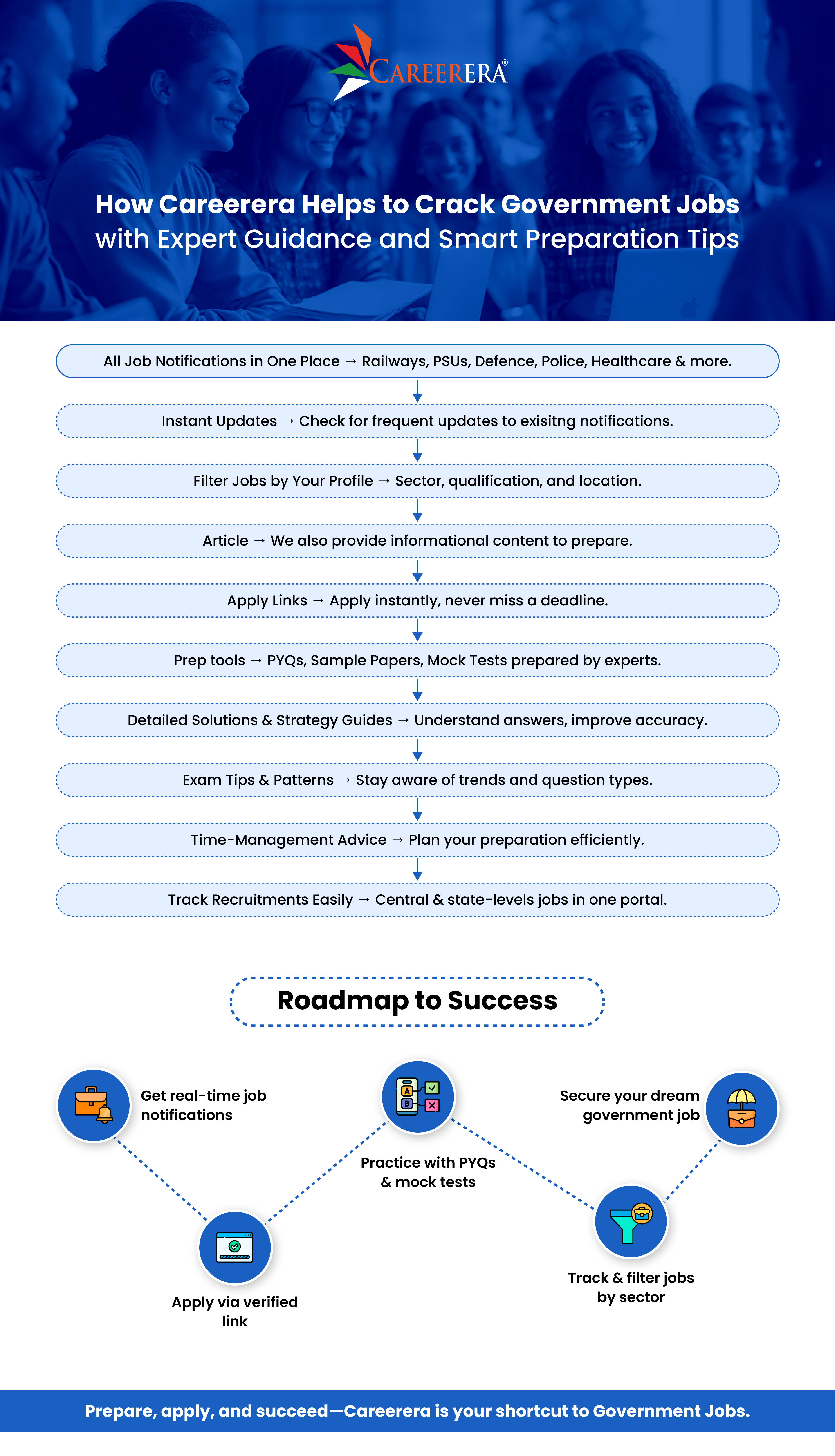 CareerEra supports government job aspirants with expert guidance and smart preparation tips designed for success. Candidates benefit from structured study plans, experienced mentors, and updated exam-focused content aligned with the latest syllabus and patterns. Smart preparation tips include effective time management, section-wise practice, regular mock tests, PYQ analysis, accuracy improvement techniques, and revision strategies. Personalized mentoring, doubt-clearing sessions, and performance tracking help aspirants identify weak areas and improve consistently, building confidence and exam readiness for cracking competitive government exams.