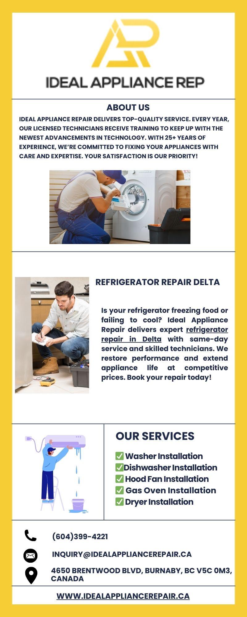 Is your refrigerator freezing food or failing to cool? Ideal Appliance Repair delivers expert refrigerator repair in Delta with same-day service and skilled technicians. We restore performance and extend appliance life at competitive prices. Book your repair today!