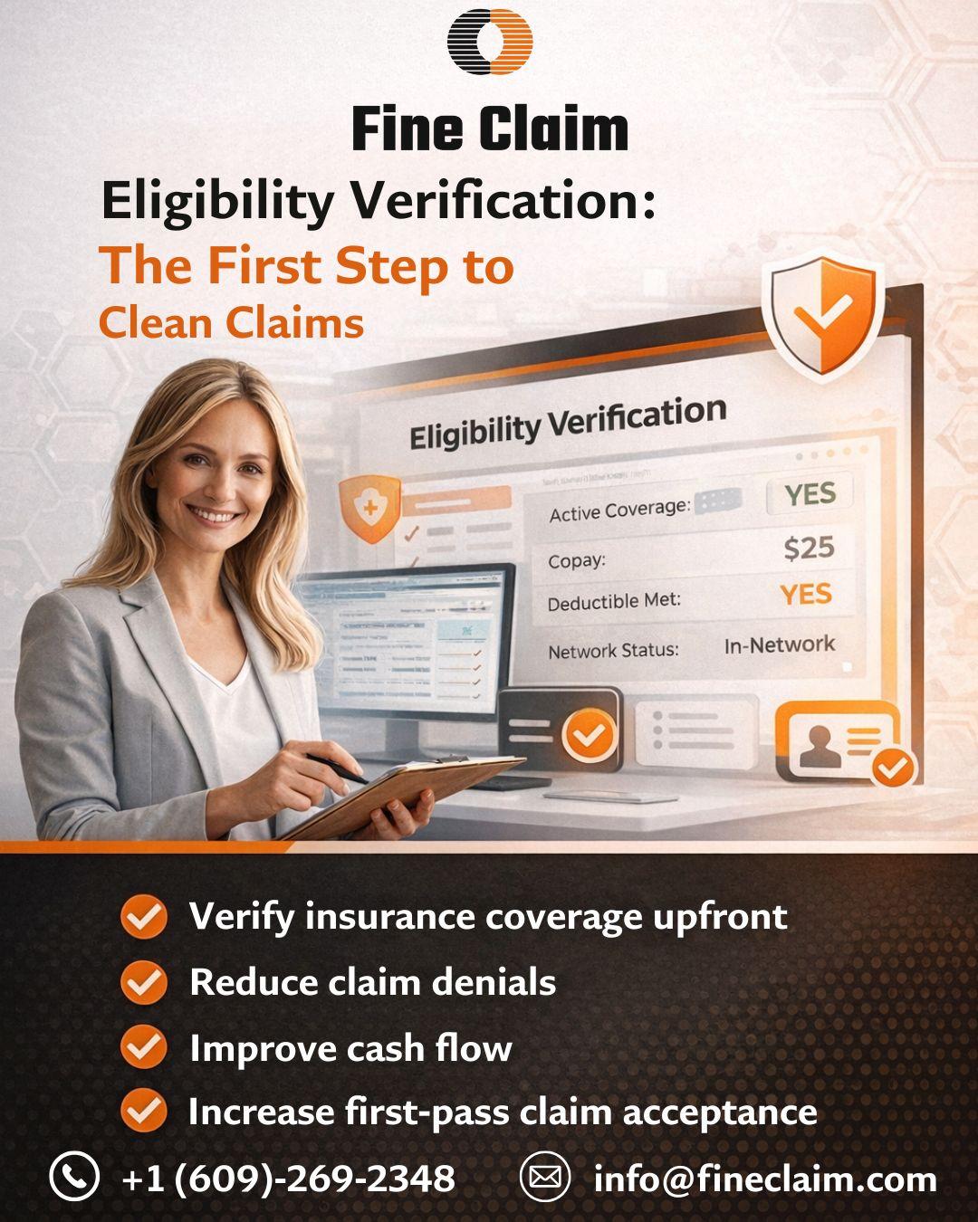 #fineclaimllc #medicalbilling #revenuecyclemanagementStruggling with claim denials? You’re not alone. Nearly 15–20% of medical claims face initial denial, impacting your cash flow and increasing AR days. At Fine Claim LLC, we combine AI-driven technology with expert revenue cycle strategies to reduce denials, accelerate reimbursements, and strengthen your revenue integrity. Let’s turn denials into approvals and optimize your revenue cycle today. Mail Us: info@fineclaim.com Call Us: +1 (609)-269-2348 Visit Us: https://fineclaim.com/denial-management-services/ #fineclaimllc #medicalbilling #revenuecyclemanagement0 Comments 0 Shares - Eligibility verification is the foundation of a healthy revenue cycle.