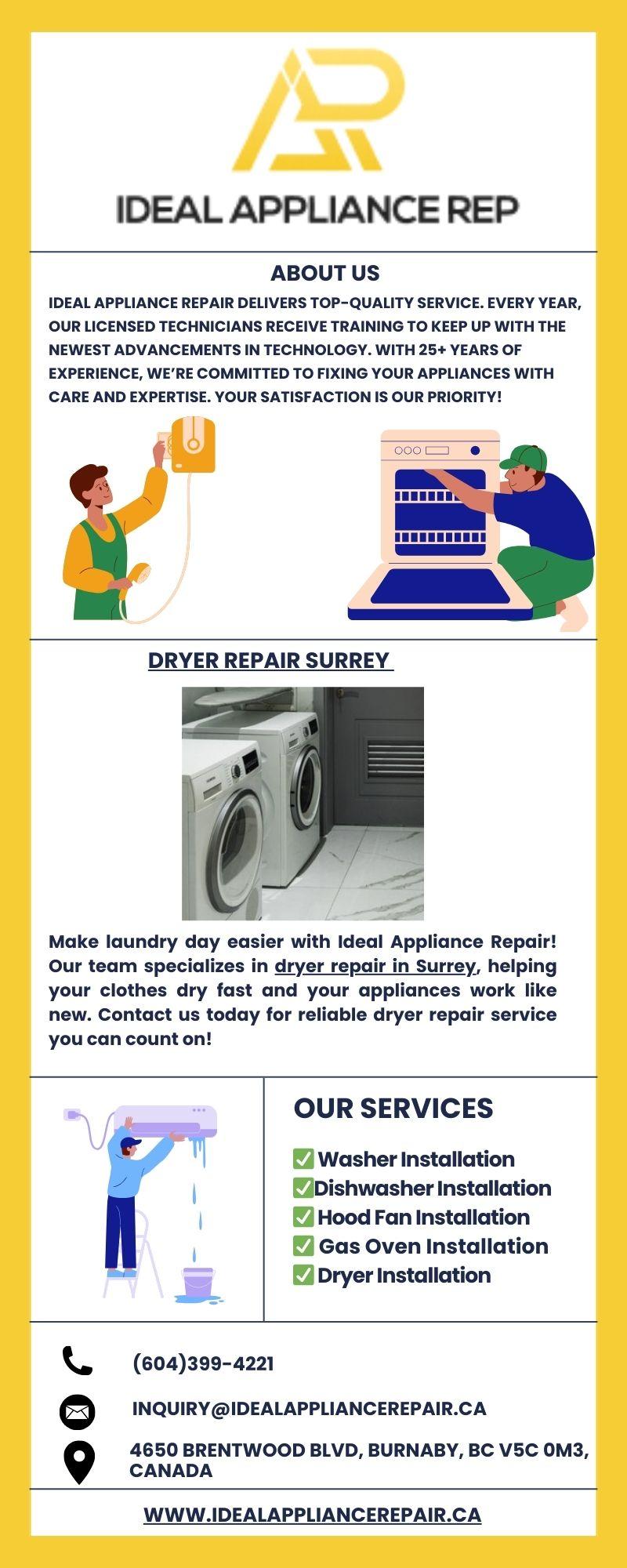 Trust Reliable Appliance Repair Surrey for all your dryer repair needs in Surrey. Our team of experts offers fast and reliable services to keep your dryer running smoothly. Contact Ideal Appliance Repair for top-quality repairs.