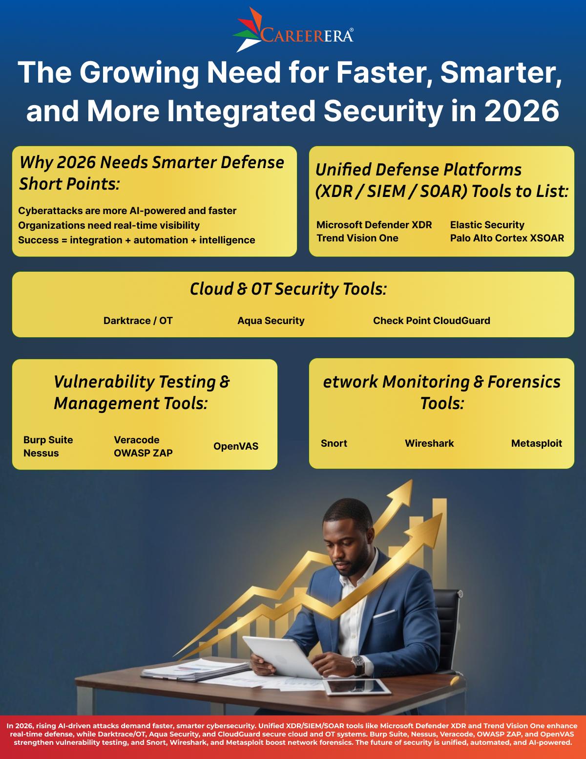 Discover the top cybersecurity tools shaping 2026 in the era of smart, unified defense. From XDR, SIEM, and SOAR platforms to cloud and OT security solutions, vulnerability management tools, and network forensics, these advanced technologies help organizations integrate, automate, and respond to threats in real time. As cyberattacks become faster and more AI-driven, leveraging comprehensive, AI-powered tools is essential to protect hybrid and cloud-driven environments. Stay ahead of evolving threats and secure your digital infrastructure with the best cybersecurity tools of 2026. https://www.careerera.com/blog/top-cybersecurity-tools