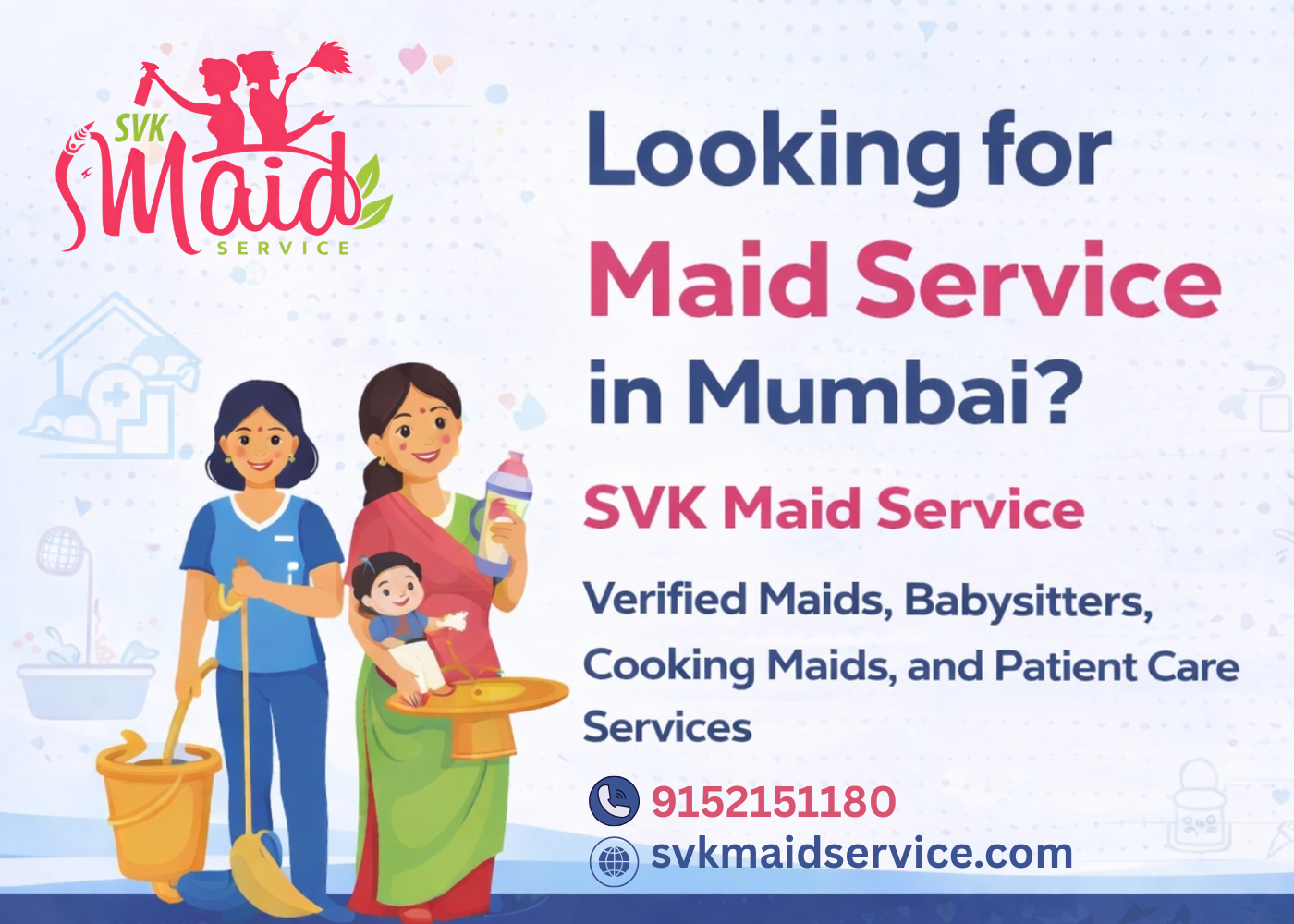 SVK Maid Service provides verified house maids, cooking maids, babysitters, elderly care, and home cleaning services in Mumbai, Navi Mumbai, and Thane.
